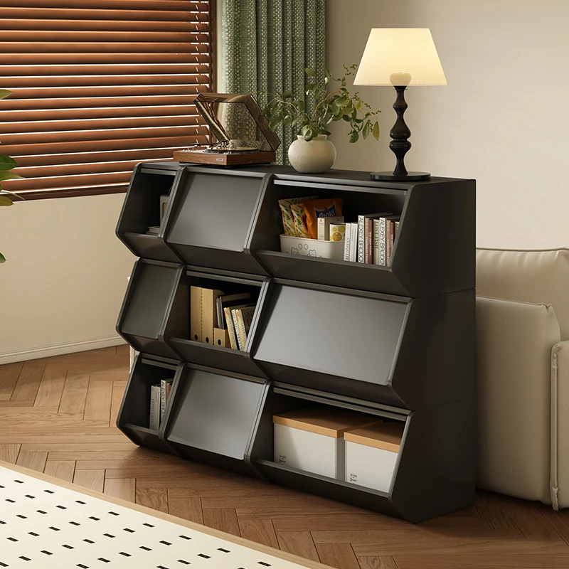 黒の収納書棚 - リビングソファ横にぴったりなスリムな収納キャビネット。おしゃれな格子デザインで、スナックや小物をスッキリ整理!コンパクトで多機能なキャビネットで、あなたの部屋をスタイリッシュに演出します。