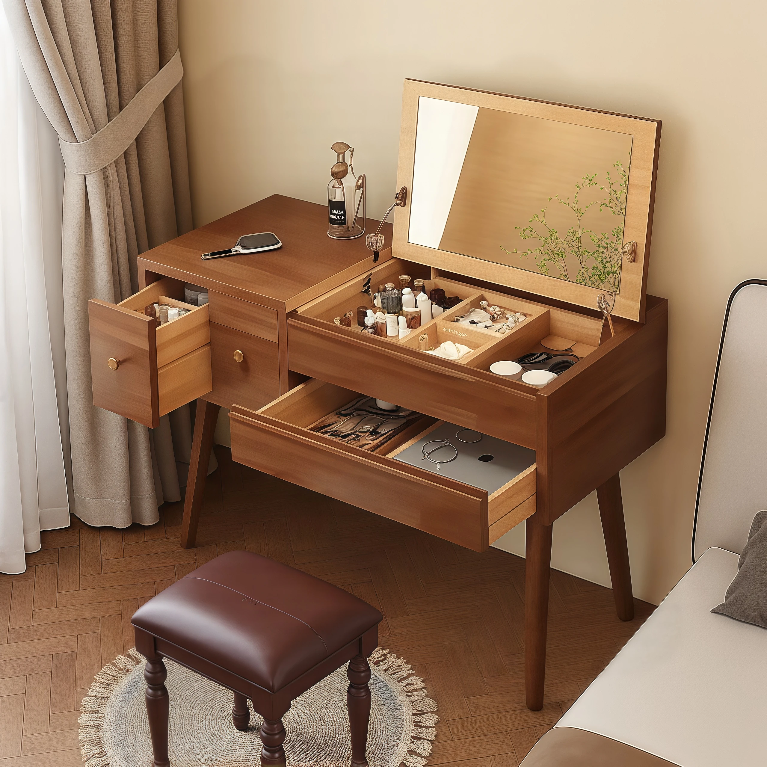 2025 New Modern Makeup Vanity - Sleek and Compact Design for Small Bedrooms, Features Solid Wood Construction, Multi-functional Dressing Table, Desk, and Nightstand with Ample Storage Solutions.