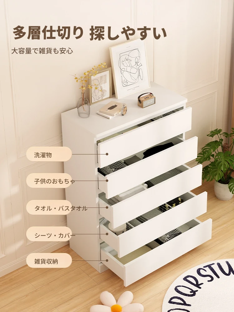 壁に寄せて使える!新作2025年版の5段チェスト。リビングや寝室に最適な収納力抜群のキャビネット。サイドテーブルとしても活躍し、スペースを有効活用します。お部屋のインテリアにぴったり!