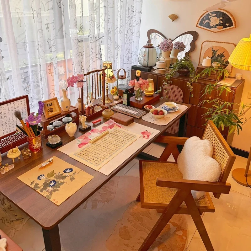 高級無垢材使用!中華風書法デスク - リビングルームに最適な長いデザイン、毛筆字や書道作品を楽しむためのスペースを提供します。優雅な雰囲気で、あなたの書道をより引き立てます。