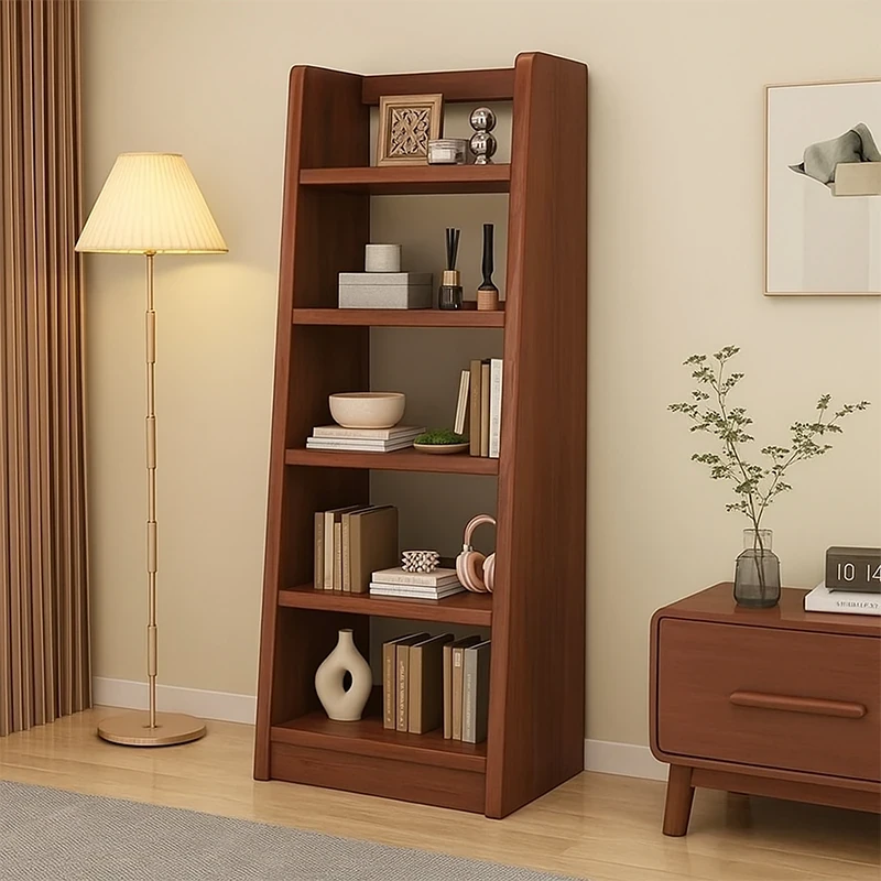 ヴィンテージ風のフロア書棚・収納ラック - おしゃれなリビングにぴったり!壁に寄り添うトライアングルデザインの多層収納ラック。学生にも最適な収納力で、雑誌や本をスタイリッシュに整理整頓。