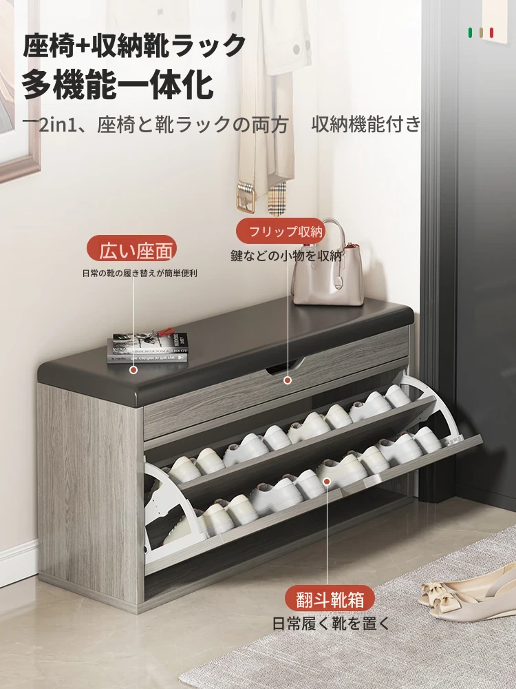 2024新作!多機能靴収納ベンチ - 家庭用・玄関の壁にぴったりフィット!靴をすっきり収納できるおしゃれなデザイン、座れるのでスペースを有効活用!お客様の生活を便利にする人気の靴ラックです。
