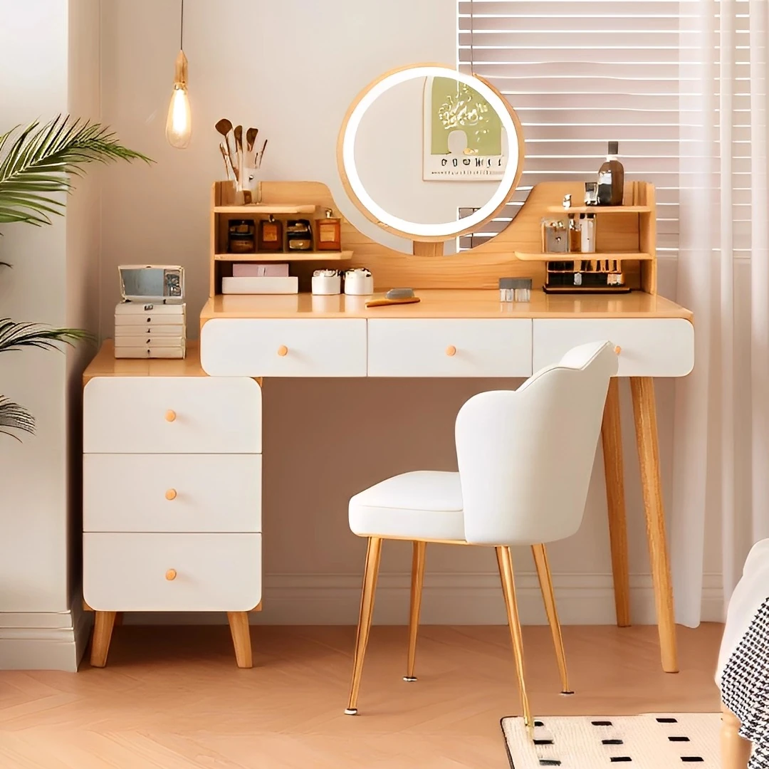 Modern Minimalist Dressing Table with Integrated Nightstand and Dresser – 2025 New Design for Bedroom with Compact Makeup Mirror and Vanity Desk