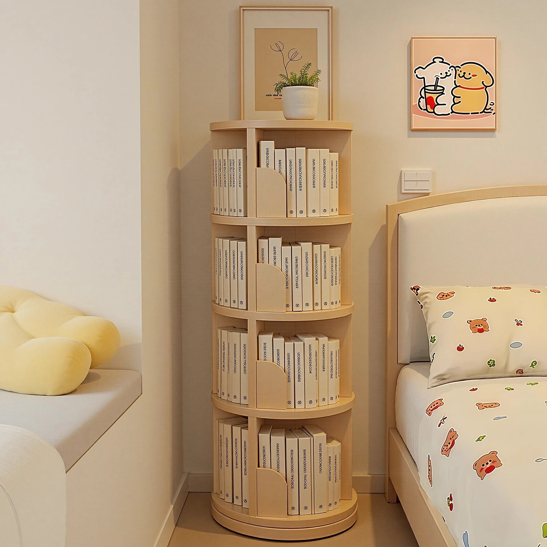 360-Degree Rotating Vertical Bookshelf - Round Floor Storage Rack for Corner Spaces, Ideal for Bedroom or Living Room, Stylish Solid Wood Nightstand and Storage Cabinet